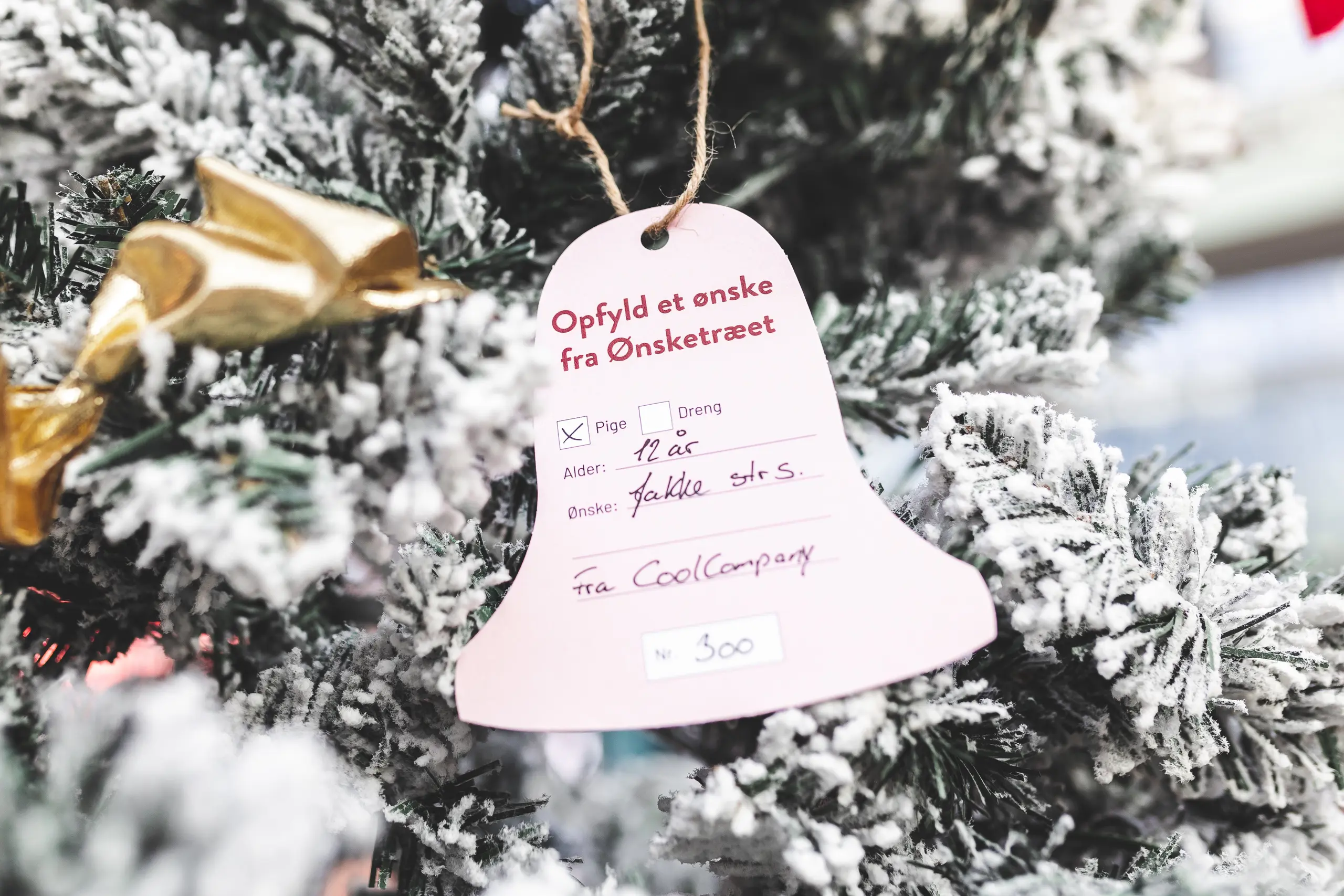 - Hvis man ønsker at opfylde et ønske fra træet, gør man det, at man tager en klokke med et ønske på. Så går ind i den butik, der står noteret på ønsket. Klokken afleveres og man betaler for produktet - og så sørger butikken for, at gaven bliver udleveret til os, så vi kan tage den med til den julefest, vi holder, hvor gaverne bliver delt ud.