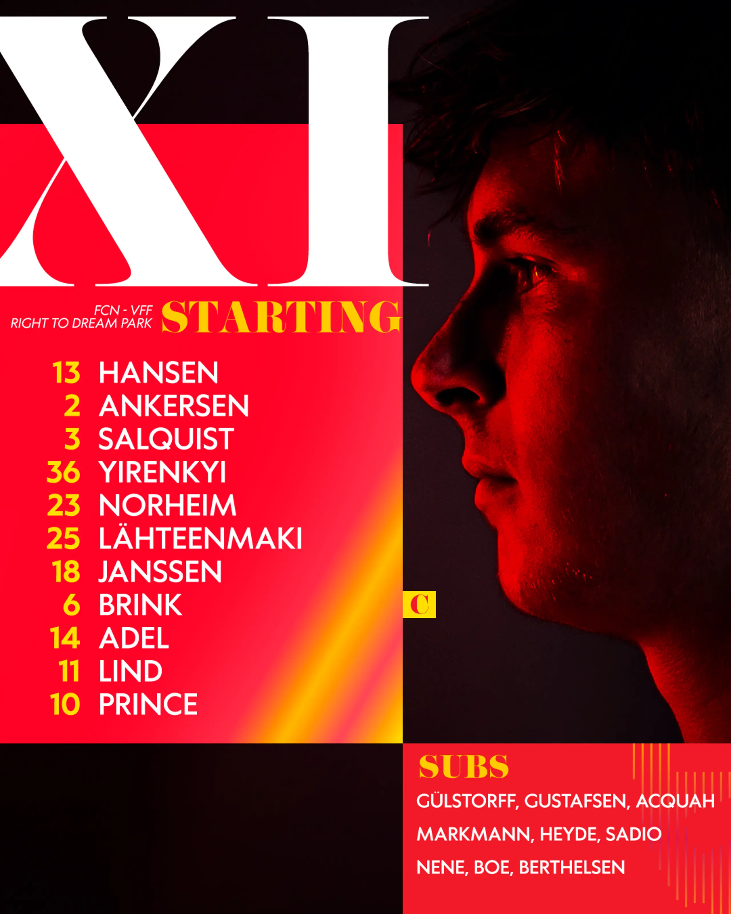 Det er 3F Superligaens to mest formstærke hold, der mødes i dag på Right to Dream Park, når Viborg FF kommer på besøg. Vi jagter tredje sejr i træk på hjemmebanen i kampen om vigtige placeringer i ligaen, og til det formål har trænerteamet udtaget følgende startopstilling.