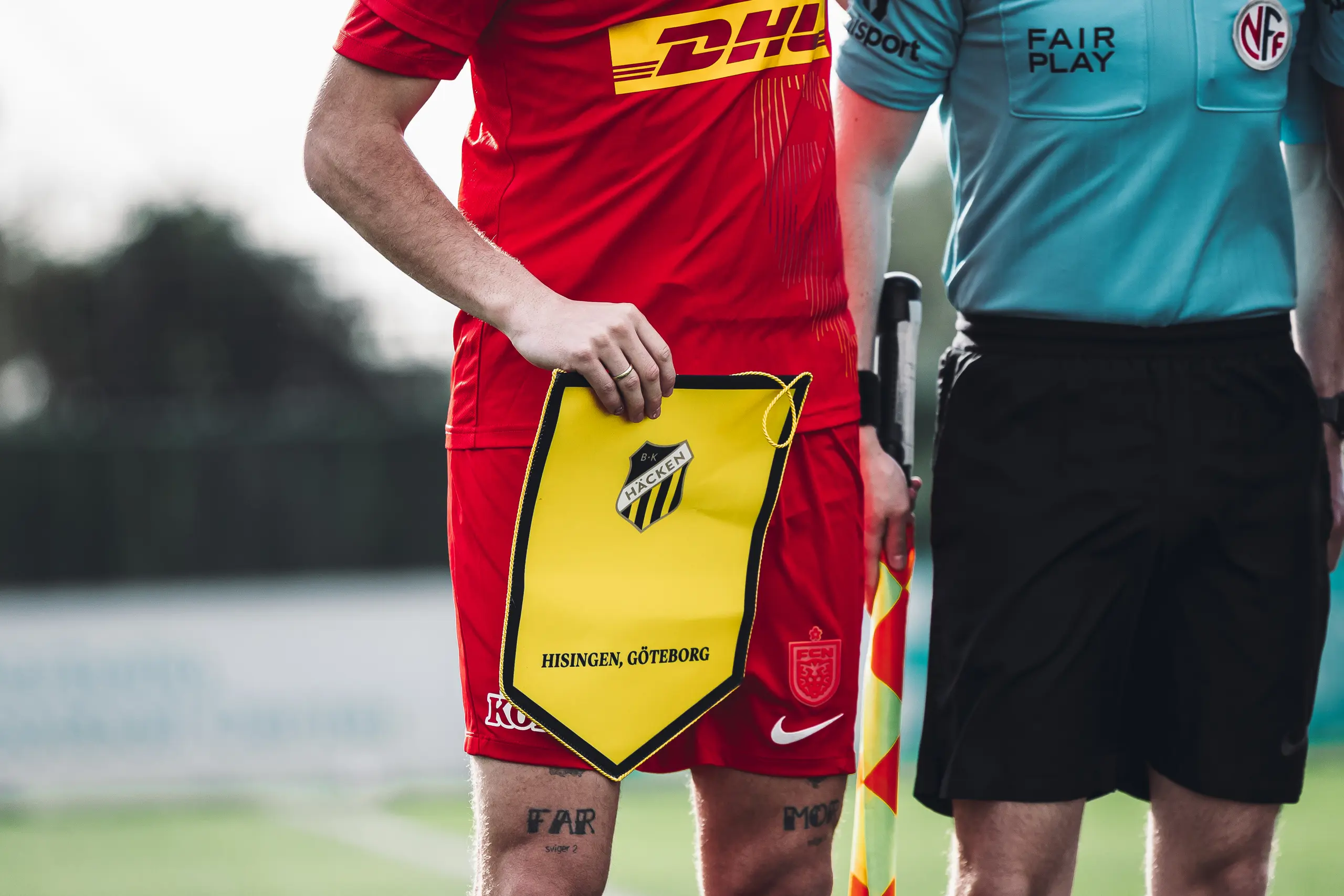 – Jeg havde altid tænkt, at jeg gerne ville have nogle tatoveringer. Jeg havde egentlig også tænkt, at det skulle være på overkroppen, men min overkrop er jo ikke den største, og så tog jeg benene i stedet for. Det kunne jeg egentlig meget godt lide, og så kan jeg også altid skjule dem, hvis det er det, jeg vil. – Jeg fik de første, da jeg var blevet 18, men ikke lige på dagen. Det var i Silkeborg, hvor jeg havde en kammerat, hvis onkel ejede en tattoo-forretning. Så var vi derinde en dag, og så spurgte han mig, om jeg ville have en tatovering. Der var lige 10 minutter inden den næste kunde, og så sagde jeg ja. – Så tænkte jeg, at det skulle være noget, som jeg ikke ville fortryde, og så fik jeg skrevet mor og far. Inden han gik i gang, spurgte jeg, hvor det gjorde mindst ondt, han pegede på låret, og så blev det der. Og mine forældre syntes, det var fint nok - min mor betalte i hvert fald for den med hende på det ene ben, siger Salquist med et grin. Siden er det gået slag i slag - eller tatovering efter tatovering - uden der har været den helt store og overordnede plan med det. Der står nogle sætninger hist og pist, der er nogle ting, der er lavet for at fylde ud, men der er selvfølgelig også nogle, der betyder meget for forsvareren. På venstre ben er der for eksempel både en engel og nogle svaler, men de er der mest for at fylde ud. Til gengæld er der andre, der betyder alt. – Jeg har et lyn her på siden af lægmusklen med min kones ansigt inden i, og så har jeg et hjerte, hvor der står Bella inden i. Det er min ældste datter. Der er også hendes håndaftryk, og så står hendes lillesøster Rosa her. – Bella er fem og Rosa er tre, men Rosa har allerede sagt til mig, at jeg skal have lavet hendes hånd også, så det må jeg jo nok hellere snart få gjort. Det er ellers ved at være et par år siden sidst. Jeg får dem altid lavet i vinter- eller sommerpausen, og de er også næsten alle sammen lavet af den samme fyr ovre i Silkeborg. Men det er ikke lige blevet til noget i den seneste tid, så jeg må tænke lidt over, hvad jeg skal have lavet ud over Rosas håndaftryk. – De to piger er også her bag på lægmusklen som et par tændstikfigurer, der holder hinanden i hånden. Så min lille familie fylder meget, og sådan skal det også være. Det er jo dem, jeg lever for, siger Tobias Salquist.